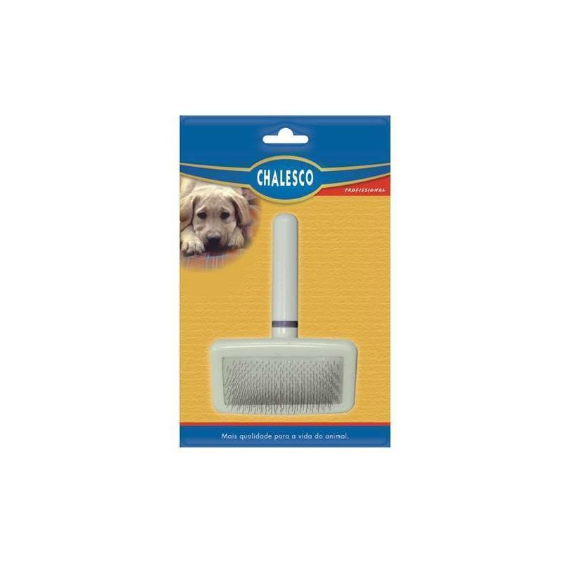 A Rasqueadeira Chalesco Macia para Cachorros é produzida com cerdas em aço inox flexíveis e cabo de madeira revestido em pvc, com detalhe na cor azul, remove os pelos mortos e evita emaranhados.