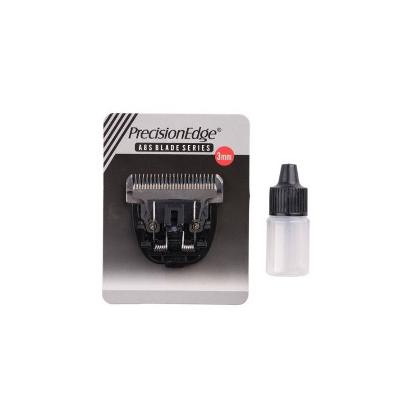 A Lâmina Precision Edge Blade 3mm A8S e A6S é fabricada em Titânio, que não aquece e, por isso, não fere o animal. Pode ser utilizada diretamente nos pelos embolados, facilitando muito o trabalho e diminuindo em até 50% a duração do serviço. Tamanho do corte: 3mm (correspondente a lâmina 7F) Lâmina não permite afiação adicional. Cortante em aço. Não é compatível em nenhuma outra máquina profissional. Indicada somente para a máquina de tosa PrecisionEdge A8S e A6S.