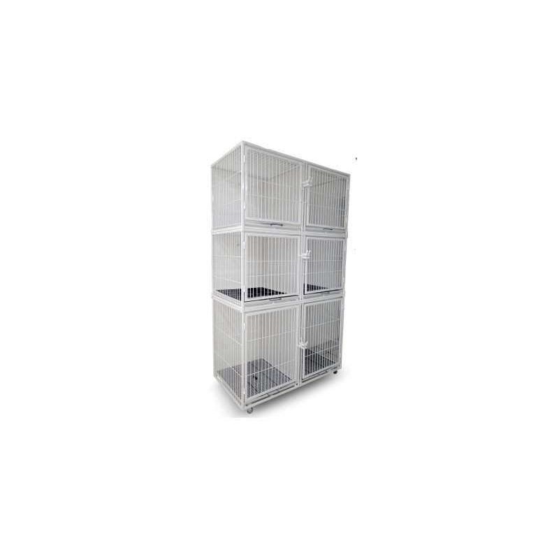 Nosso canil é fabricado em aço carbono esmaltado, material de boa qualidade e durabilidade, conta com três módulos sobrepostos totalizando 6 lugares e os módulos possuem duas medidas diferentes: