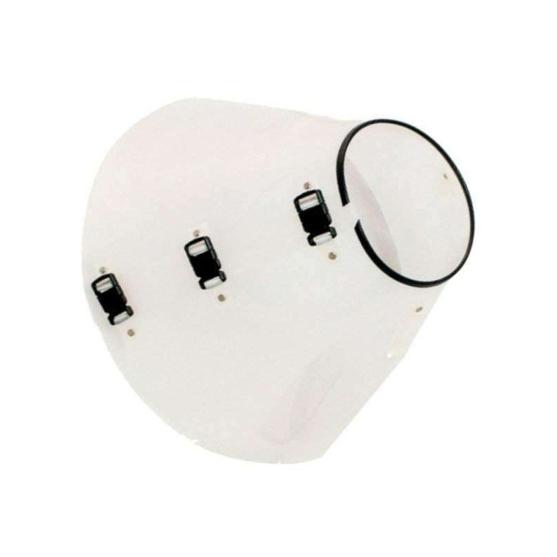 Colar Elizabetano fabricado em Polipropileno, com borracha para maior conforto ao animal, com tiras para passar a coleira. Com fecho de engate fácil.