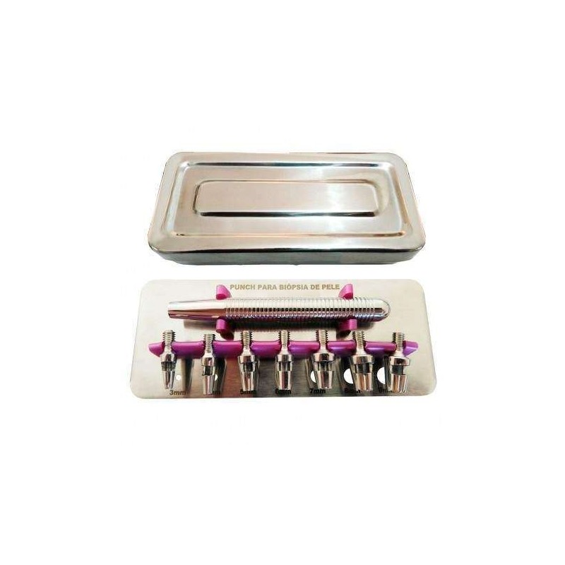 Conjunto de Punch c/ 8 medidas, c/ ponteiras intercambiáveis de 2 / 3 / 4 / 5 / 6 / 7 / 8 e 9 mm. Acompanha caixa de inox de 18x08x03cm, bandeja com suporte de silicone autoclavável.
