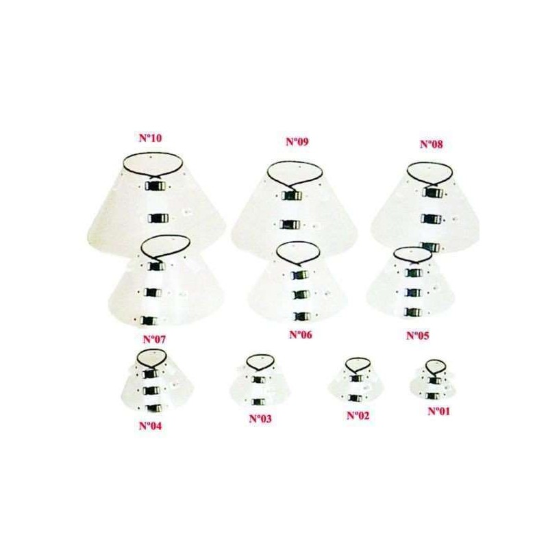 Colar Elizabetano fabricado em Polipropileno, com borracha para maior conforto ao animal, com tiras para passar a coleira. Com fecho de engate fácil. Conjunto c/ 10 tamanhos.