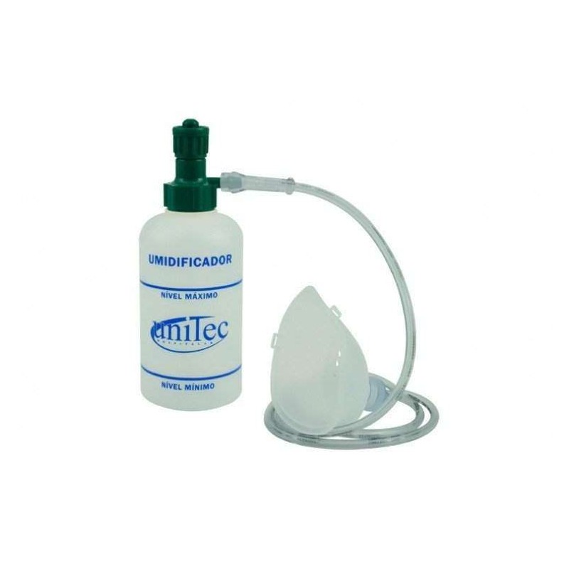 Umidificador composto de tampa e porca em nylon injetado, rosca no padrão ABNT, frasco de 250 ml em PVC com nível máximo e
