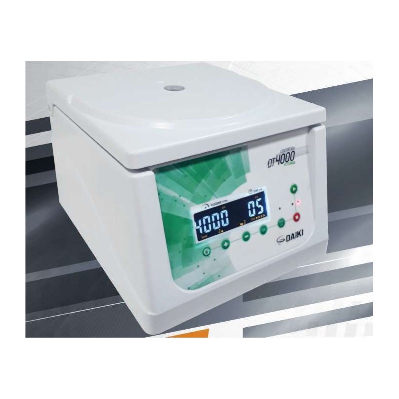 O modelo DT-4000-12 possui display em LCD para visualização da velocidade ou RCF, tempo da centrifugação e programação de aceleração e desaceleração. Motor de indução (sem escova de carvão), que evita a poluição por poeira de carbono, com baixa vibração e baixo ruído. Com trava que não permite o funcionamento com a tampa aberta e alarme ao término do processo.