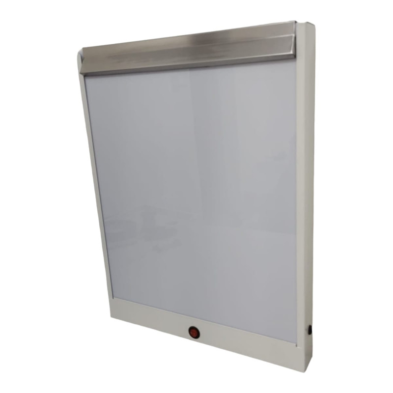 Construído em chapa de aço espessura de 0,46 mm bitola 26# em pintura epóxi, com frente de acrílico leitoso de 3 mm de espessura, fixação de RX por roletes, em 110volts, duas Lâmpadas de LED 15 W cada, plug bipolar.