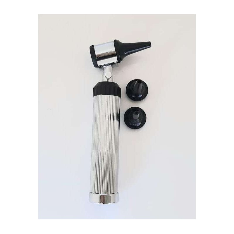 - Otoscópio com cabo em metal cromado inoxidável para duas pilhas médias comuns. ( não inclusas)