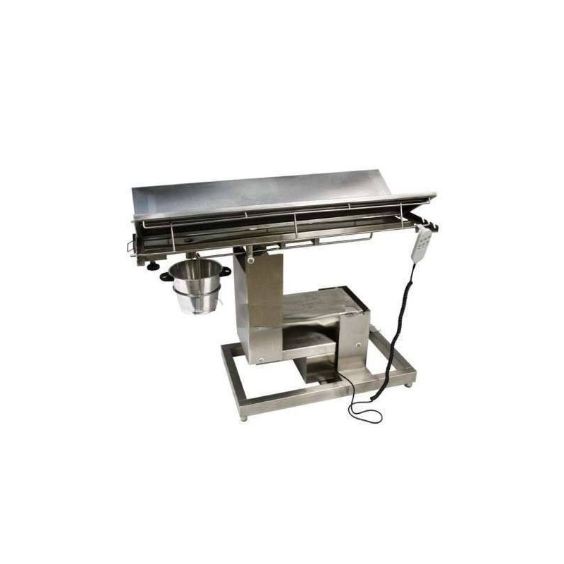 Mesa cirúrgica em aço inox 304 com sistema pantográfico, calha ajustável e controle por 2 motores — ergonomia, higiene e versatilidade para clínicas veterinárias.