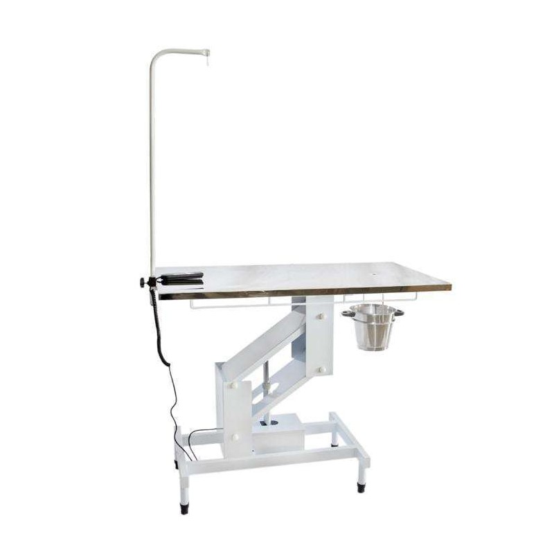 Tampo e chapa em aço inox reforçados para não assustar o animal, com vincos e furo para escoamento de líquidos, acabamento interno sem deformação da chapa e manopla para inclinação lateral. Base para regulagem de altura automática, esmaltada de branco. Acompanha suporte de soro em aço inox e balde de alumínio.