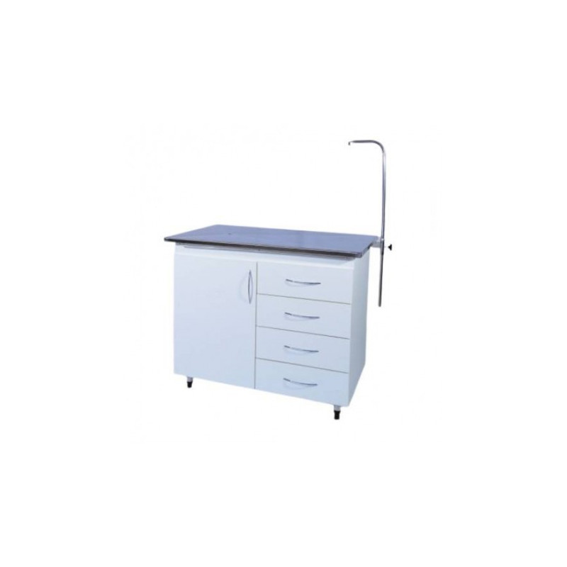 Gabinete fabricado em MDF, tampo em aço inox 304 com chapa reforçada, com vincos e dreno para escoamento de líquidos, acabamento interno sem deformação na chapa, gabinete em com 4 gavetas e armário com 1 prateleira. Acompanha suporte de soro e balde em alumínio.
