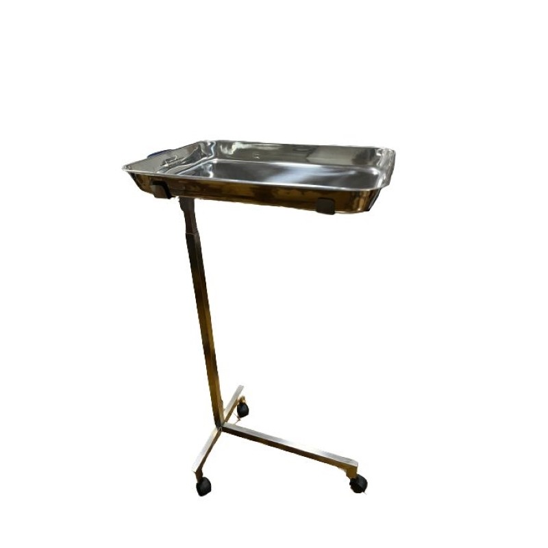 Tampo em aço inoxidável, pés em aço inoxidável com altura regulável e rodízios.