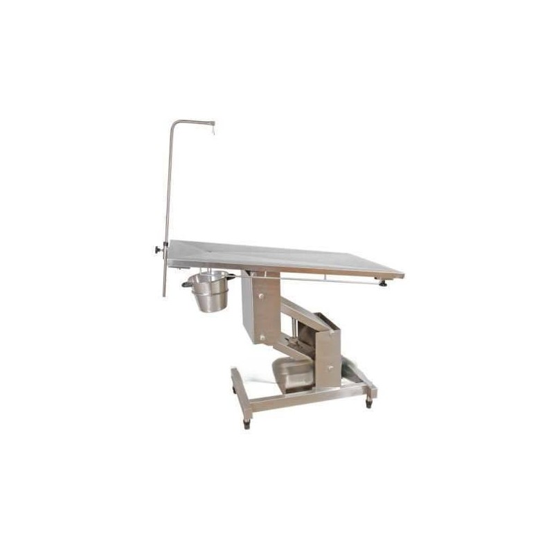 Mesa cirúrgica em inox 304, ajustável em altura e inclinação por dois motores, com dreno, rodízios e acessórios – ideal para clínicas veterinárias.