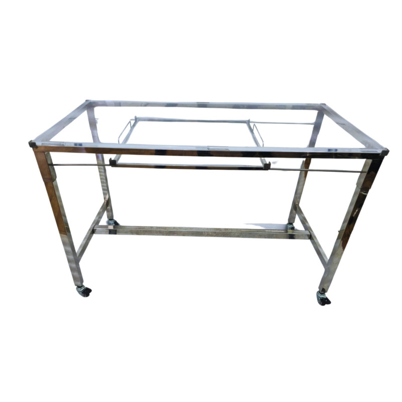 Descrição: Tampo em acrílico branco importado de 10mm; apoio móvel em MDF para chassi; pés em tubo quadrado de 40x40 mm em aço inoxidável e rodas de 3".
